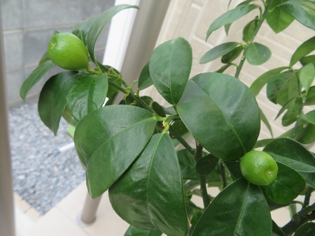 7月26日に 書いて以来となる玄関のキンカンです。 なんと、小さな実が2つなっていました。 少し前に気づいていましたが、なかなか書けないでいまし···