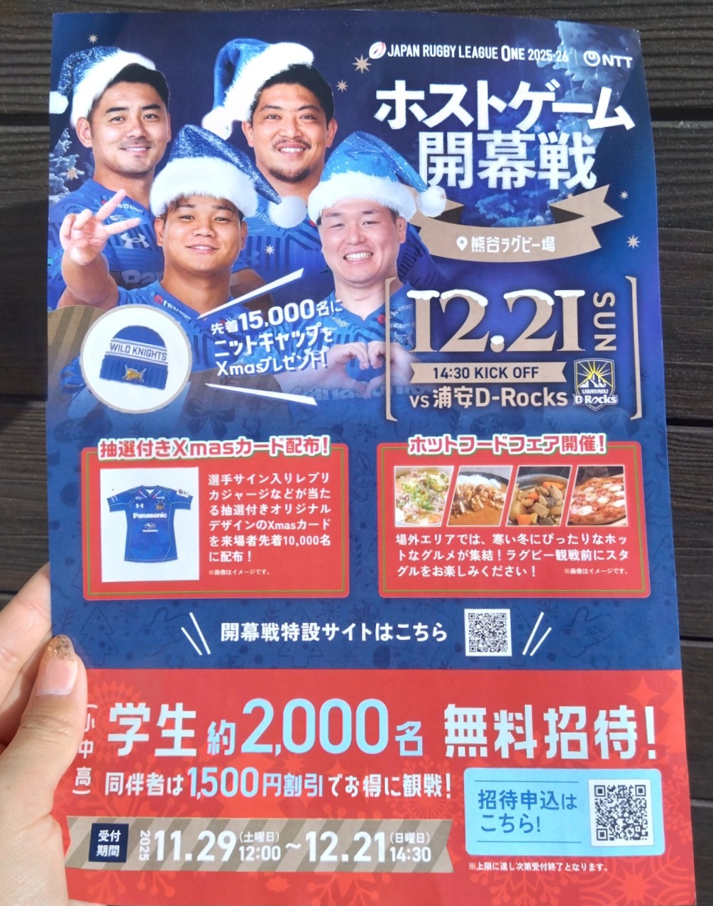 【熊谷市】埼玉ワイルドナイツ開幕戦に”学生2000名”無料招待! 家族も1500円引きでお得に観戦♪ 先着順なので急いでっ!!